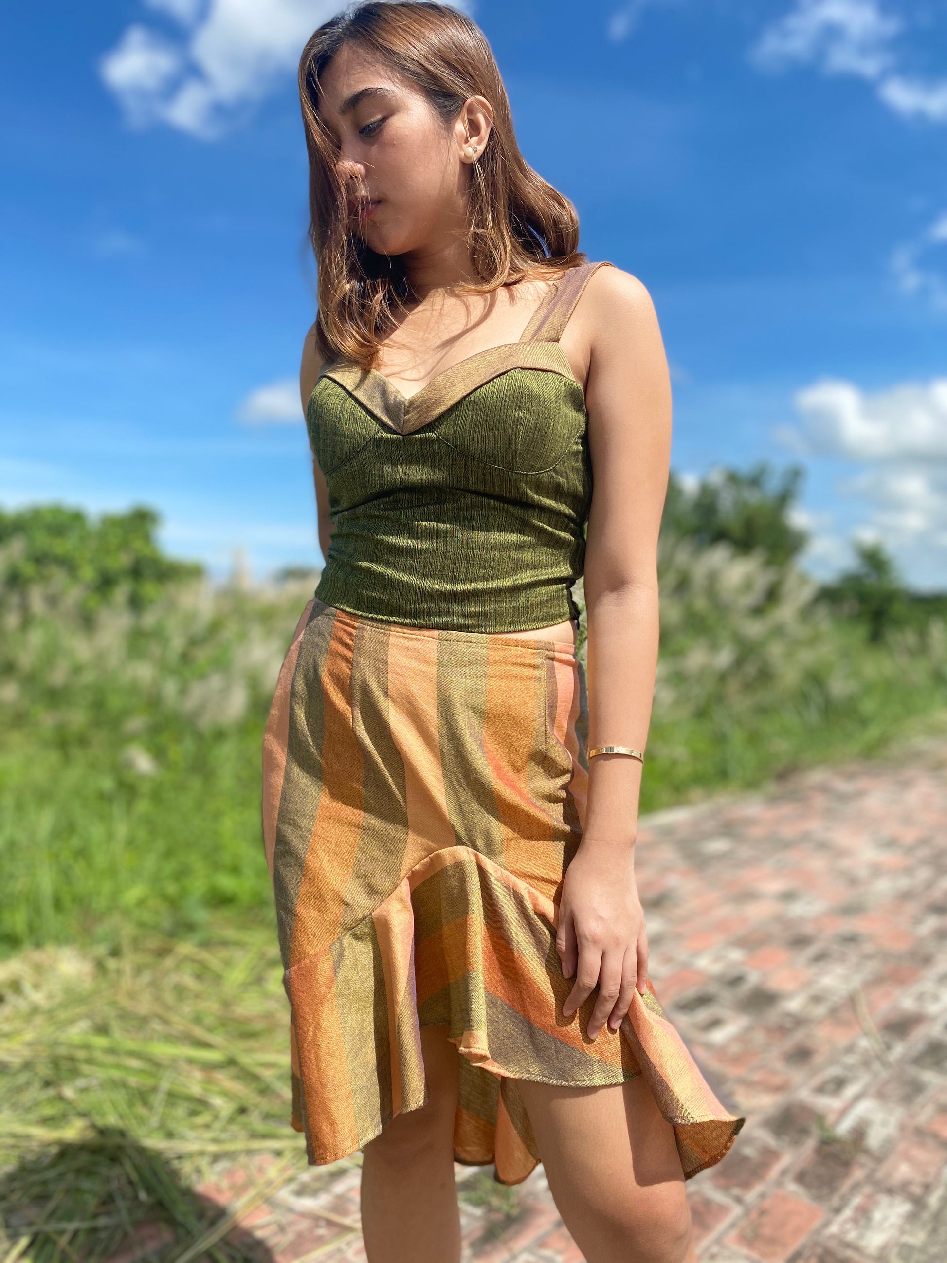 The sweet Aly, stipes, and lovely olive green corset this dress is handwoven by Negros Island - Philippines Artisans and designed by Vida Hayes. An A-line stripe combination thread creates a modern look, by using Hablon traditional woven. This cute skirt comes with a lovely olive green corset that matches your daily style.