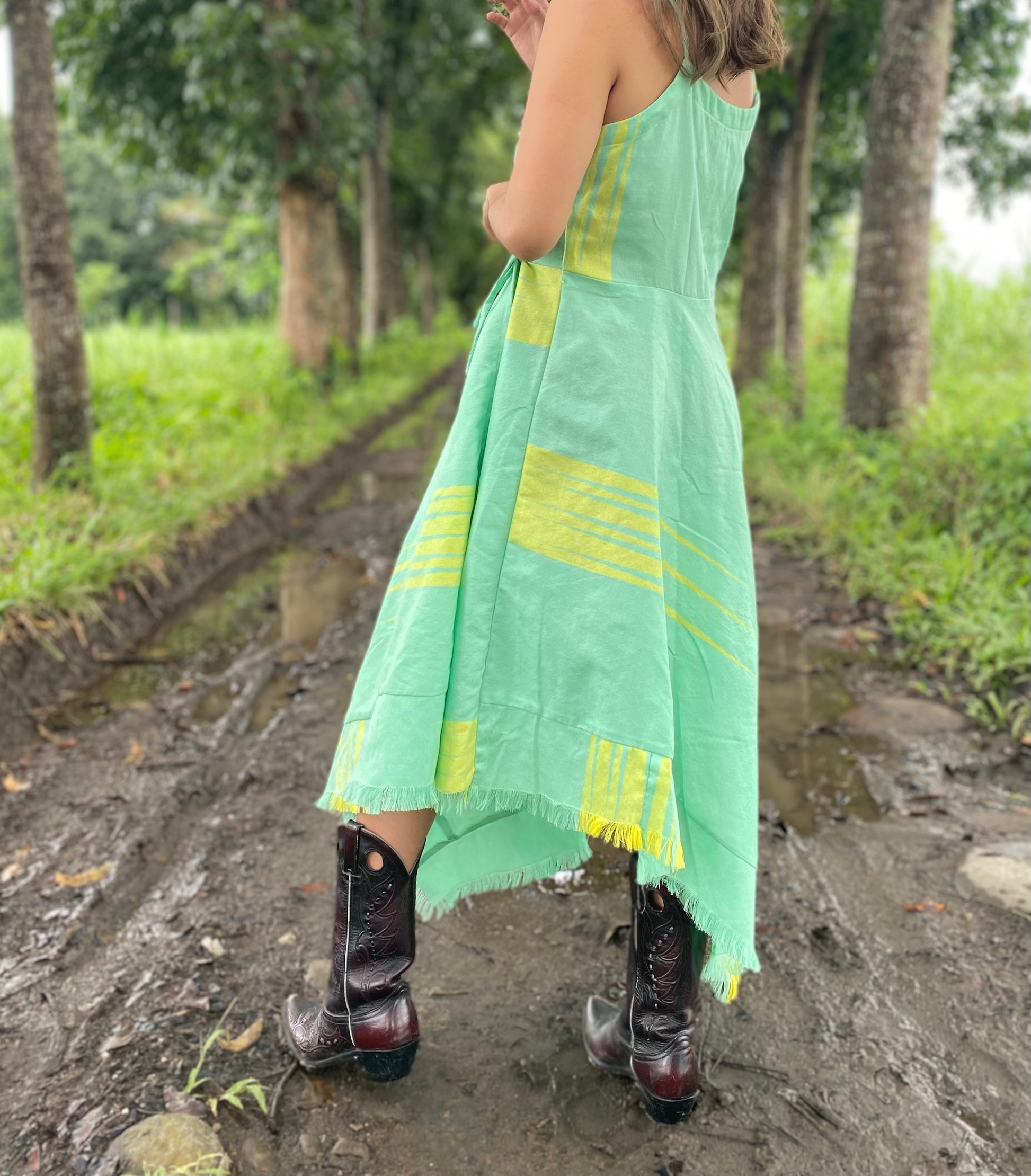 Lovely Martha, elegant sundress designed by Vida and 100% crafted woven by Negros Island Weavers. The dress features a lush color with a spag strap and a defined waist that creates a flattering silhouette, a cute belt to complete the look.