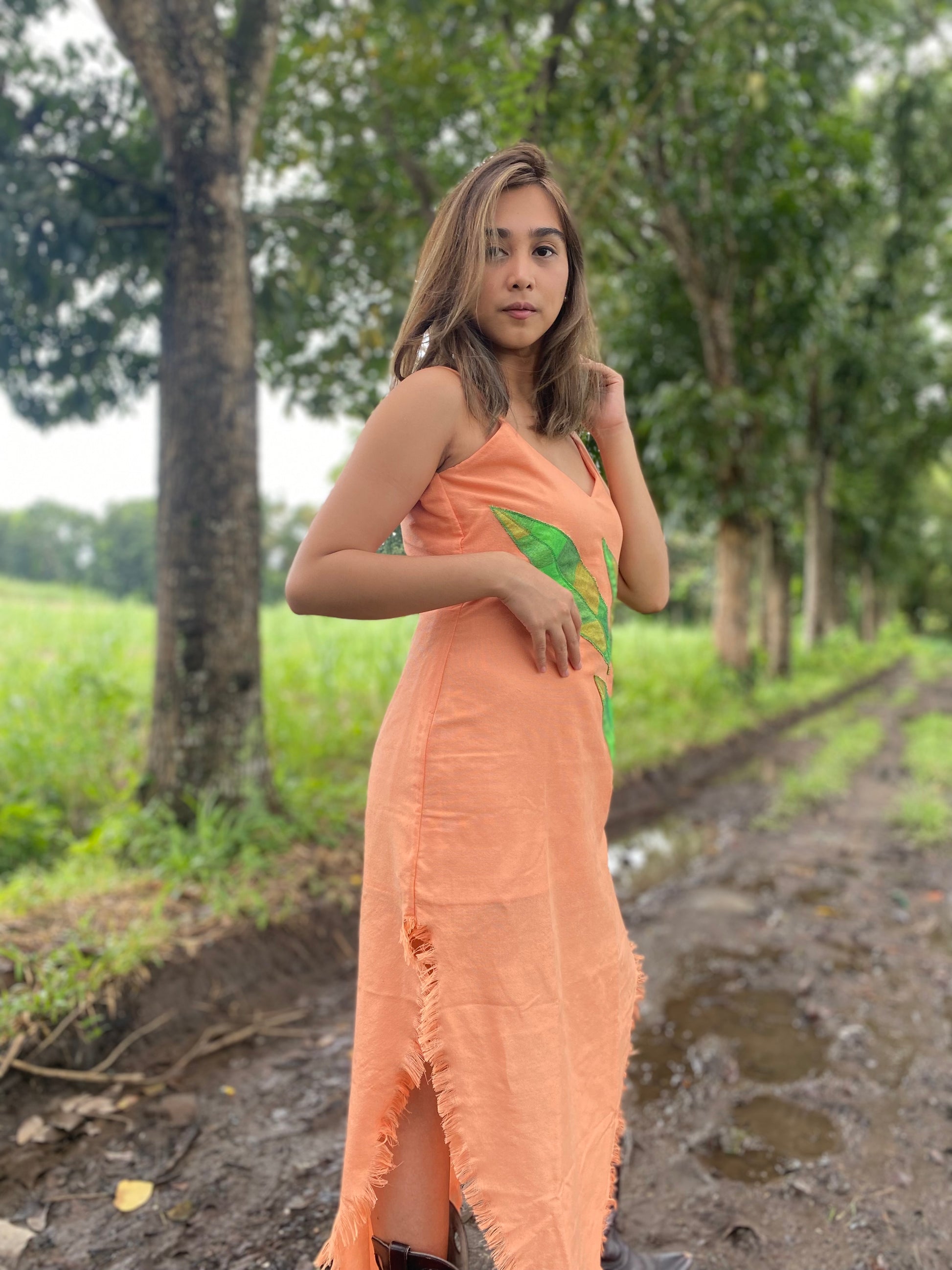 Peachy senorita dress is Jael, this handwoven spag strap long V dress is lightweight and comfortable. The V-fringes dress features upcycled leaf patch in lime colors and shows contrast in a lovely peach outfit. Jael is 100% handwoven by Negros Island Weavers.