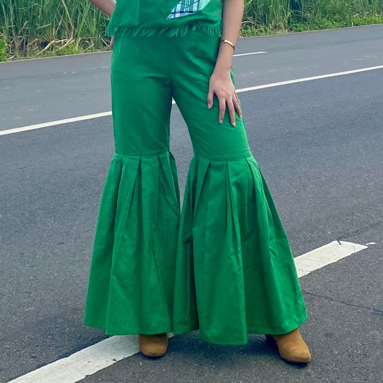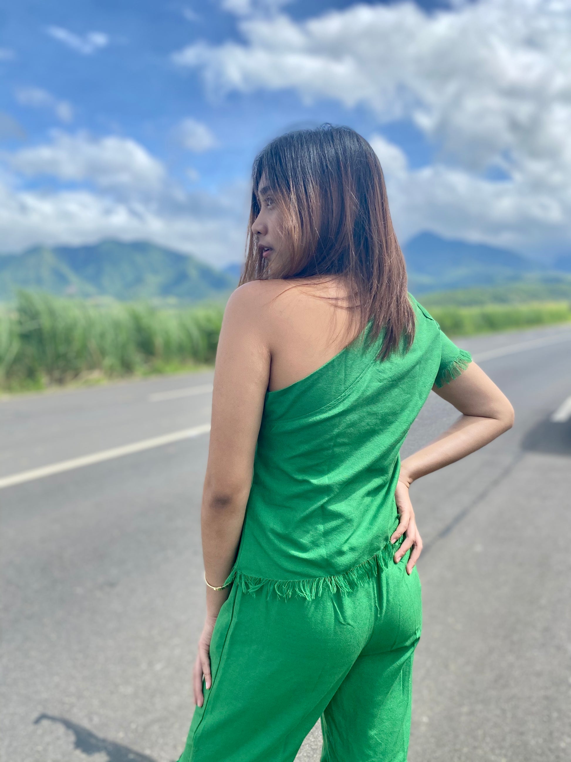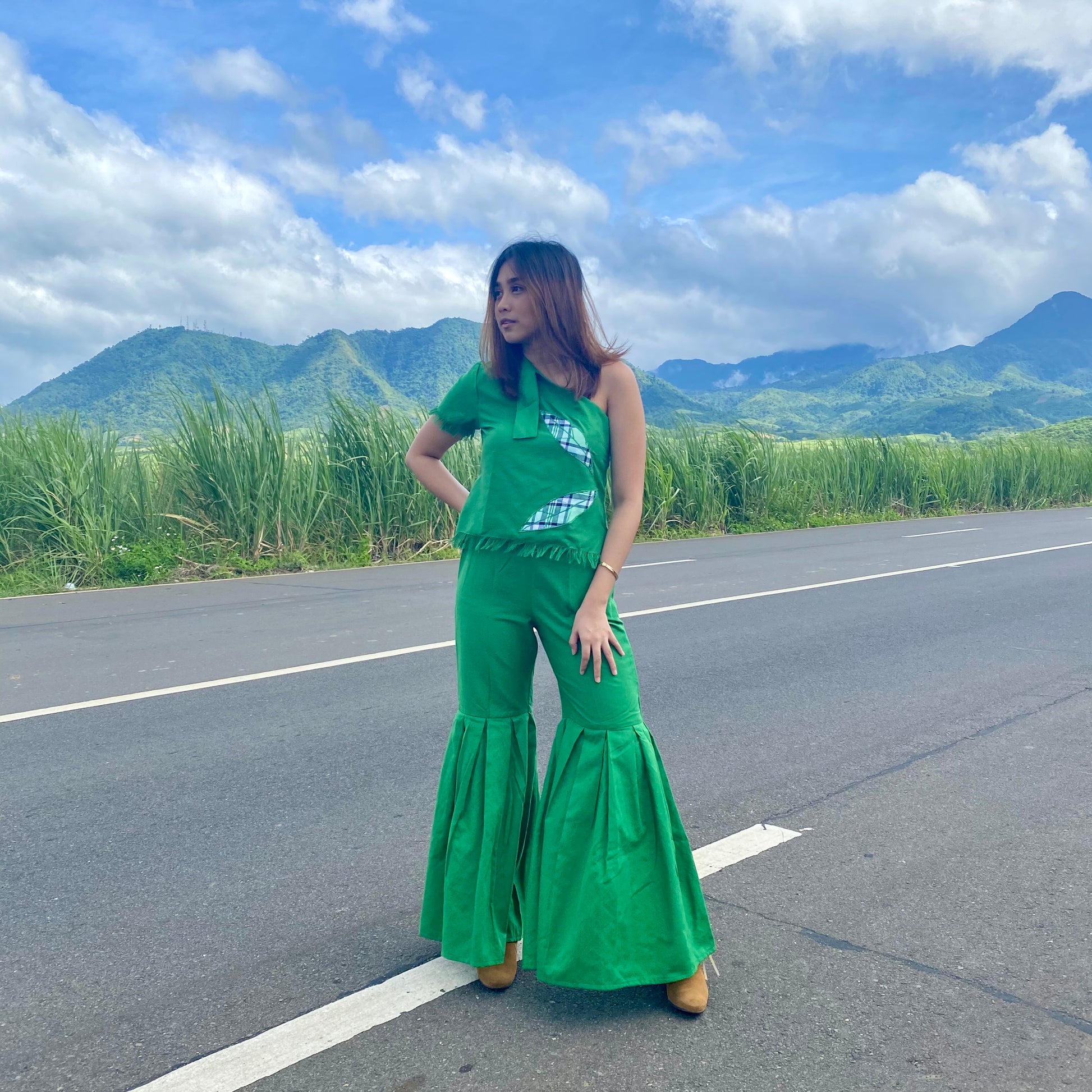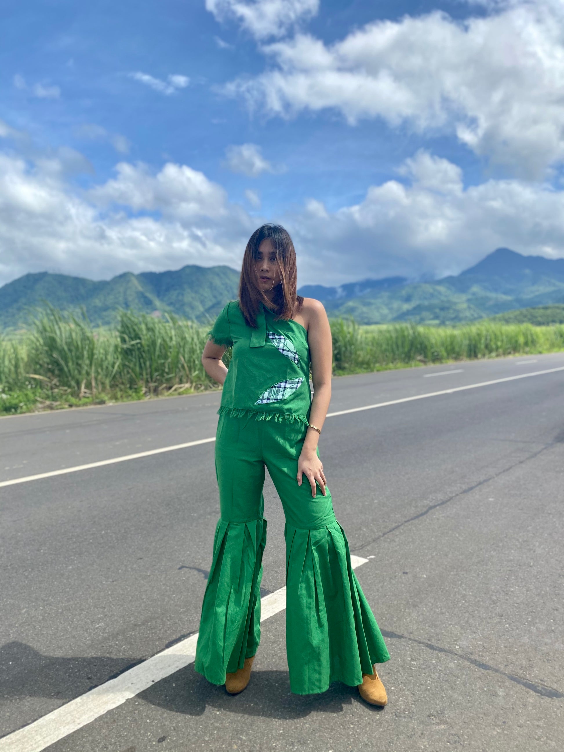 Fab Abigail, this stylish pair is 100% handwoven by Negros Island Weavers. This pretty trouser features intricate shirring cut using sophisticated green color and matches a pocahontas top, this look is elegant finishes with hablon plaid leaf's patch.